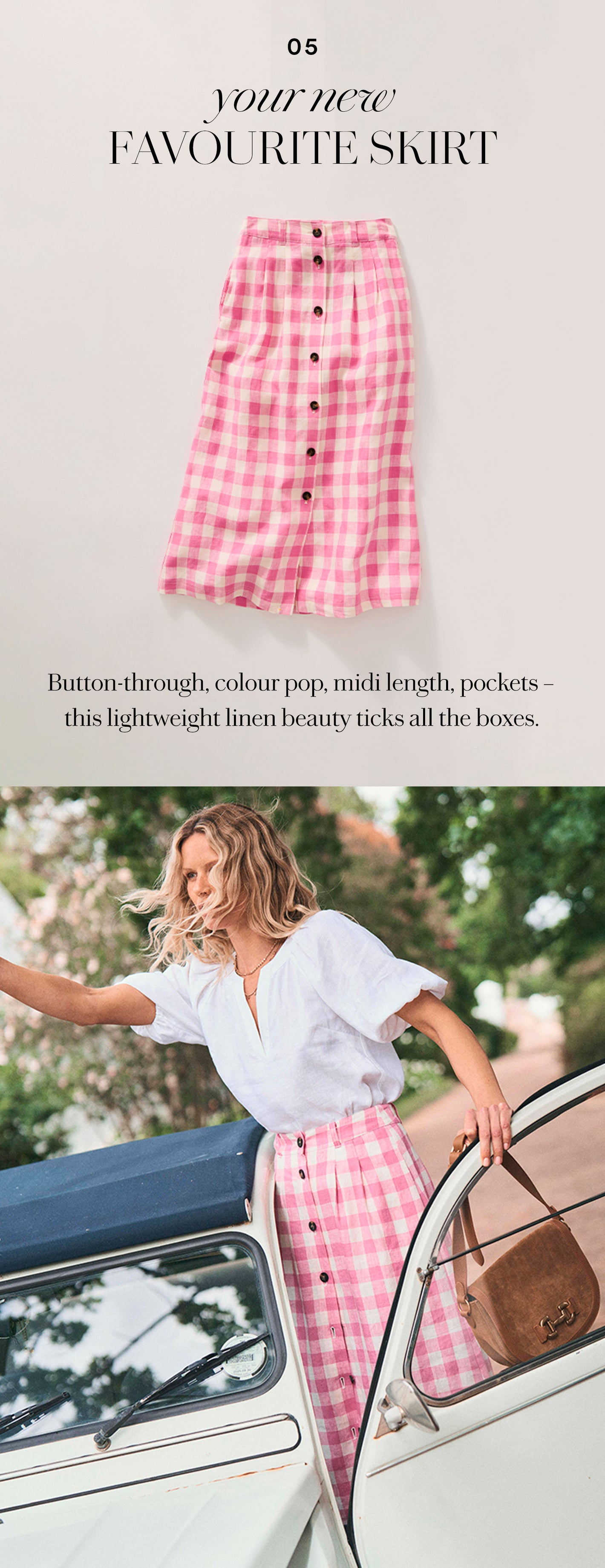 Vintage cars, the sun on your skin, a favourite shirt – there are some things we’ll never get tired of. And when it comes to versatile looks that have plenty of mileage, checks, stripes and florals are firmly in the driving seat. Forever pieces, holiday spirit and sat nav, what more does a girl need?