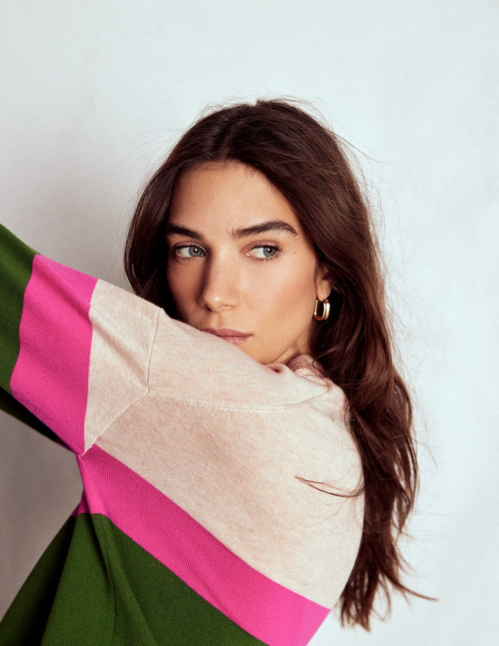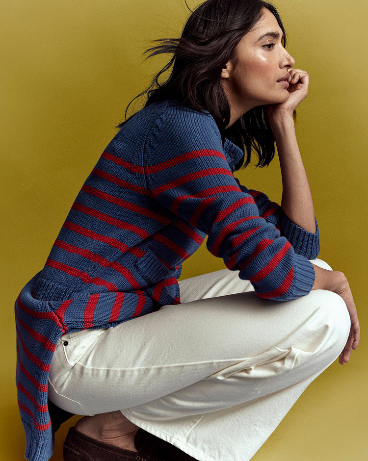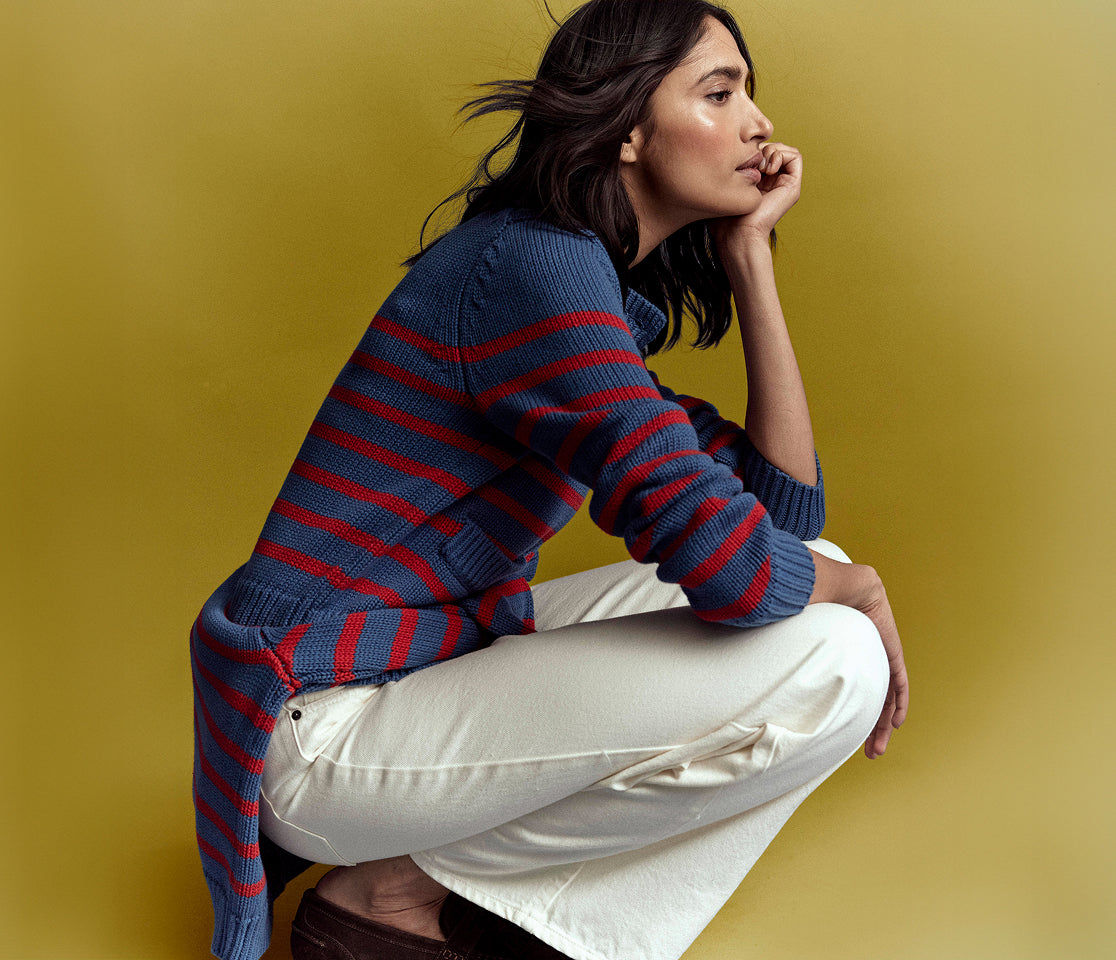 Four women wearing colourful knitted sweaters with text about a classic design re-imagined.
