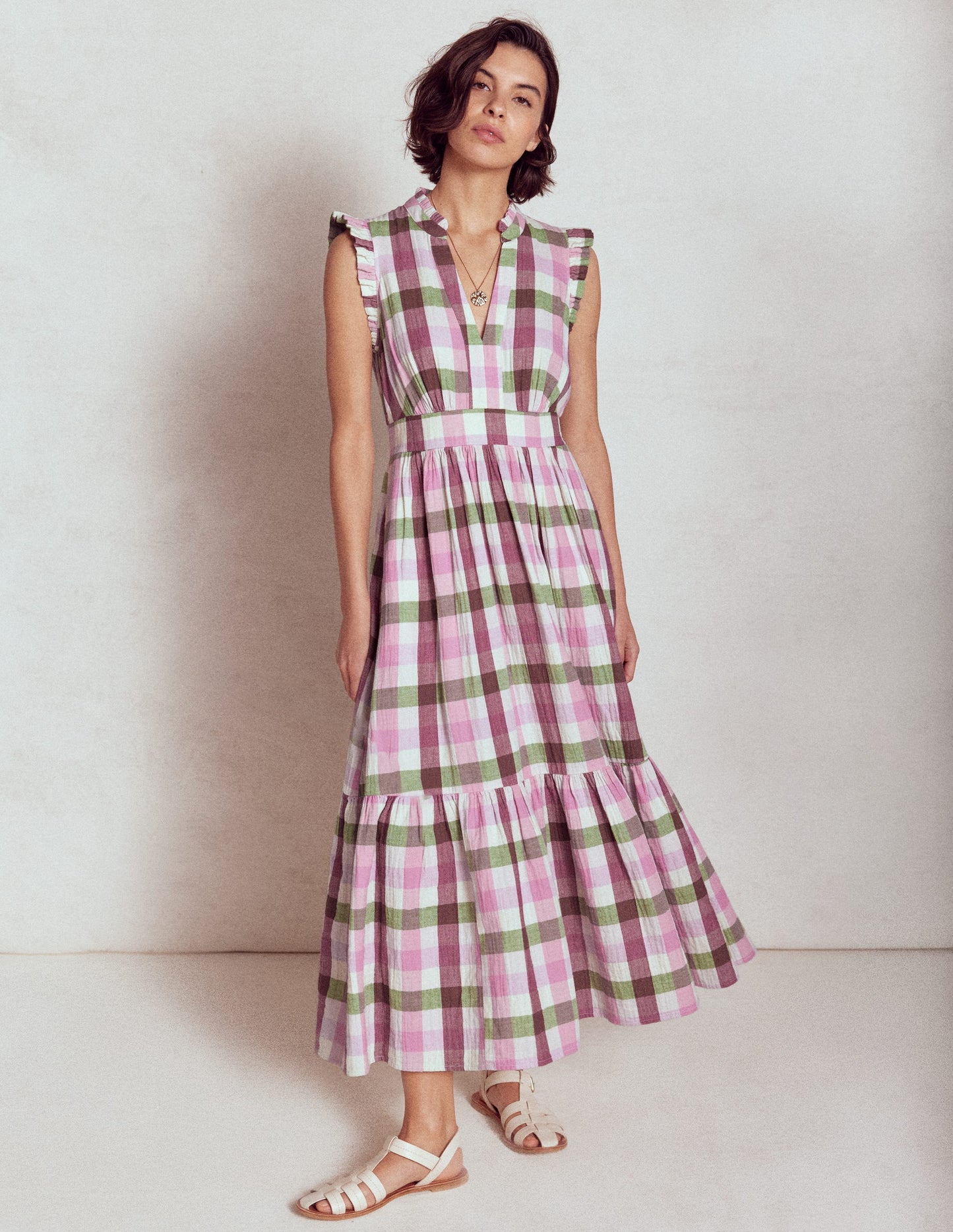 Wren Double Cloth Midi Dress Pink and Green Multigingham