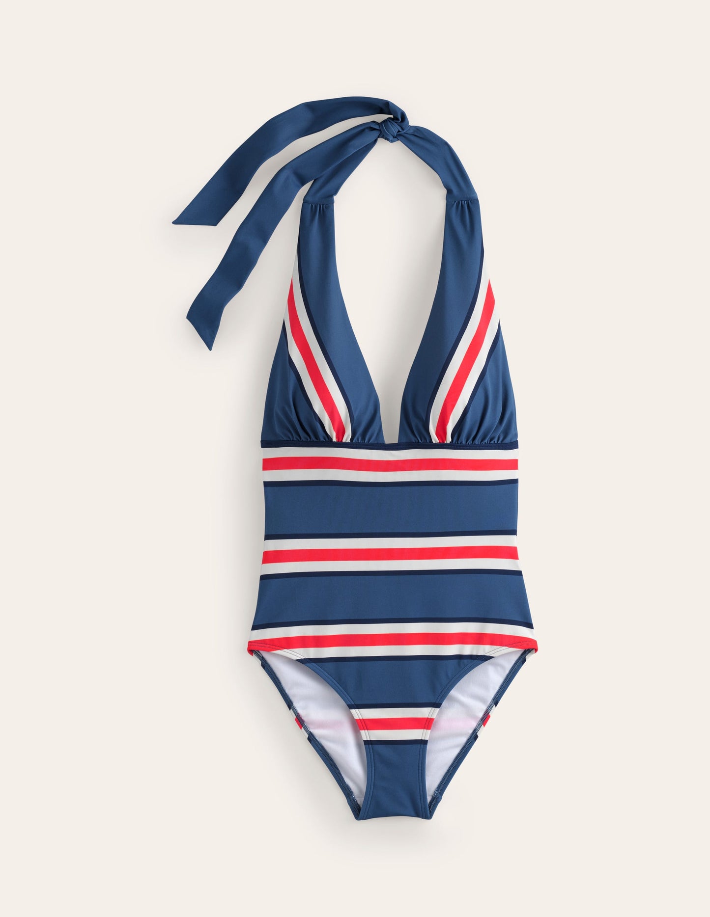The deep V-neck gives this swimsuit icon status. Complemented with pleated detailing, panelling, and an adjustable tie neck, it's finished in a punchy print.
