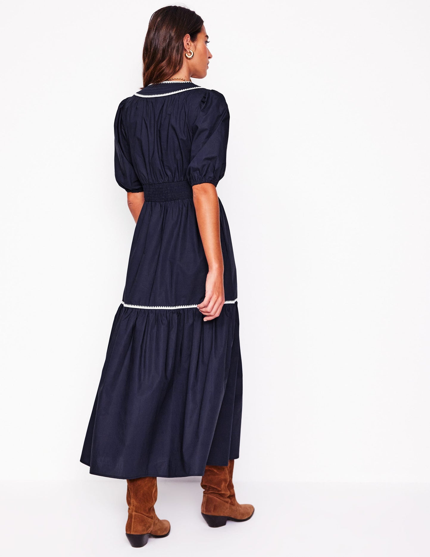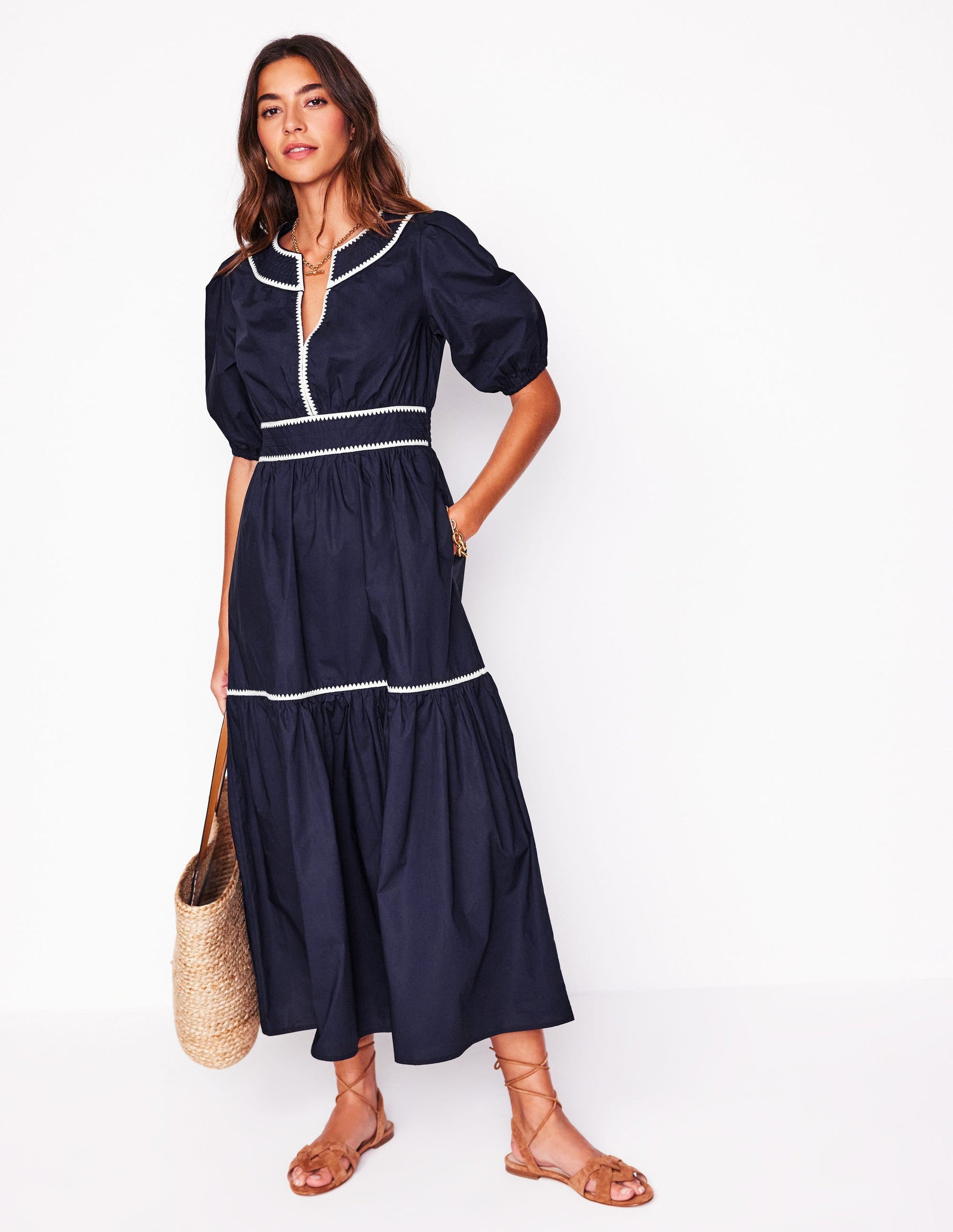We can’t get enough of tiered midi dresses. Which is why we dreamt up the Rhea with its embroidered blanket stitch trim. . . more