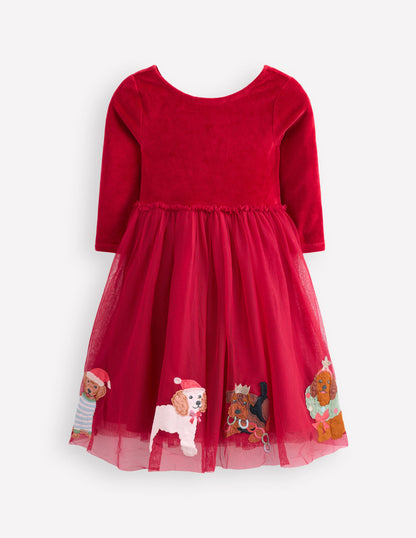 Velvet Tulle Appliqué Dress Carmine Red Festive Dogs